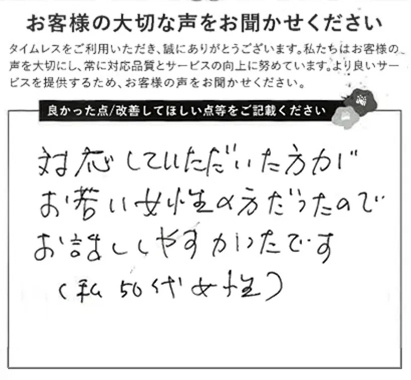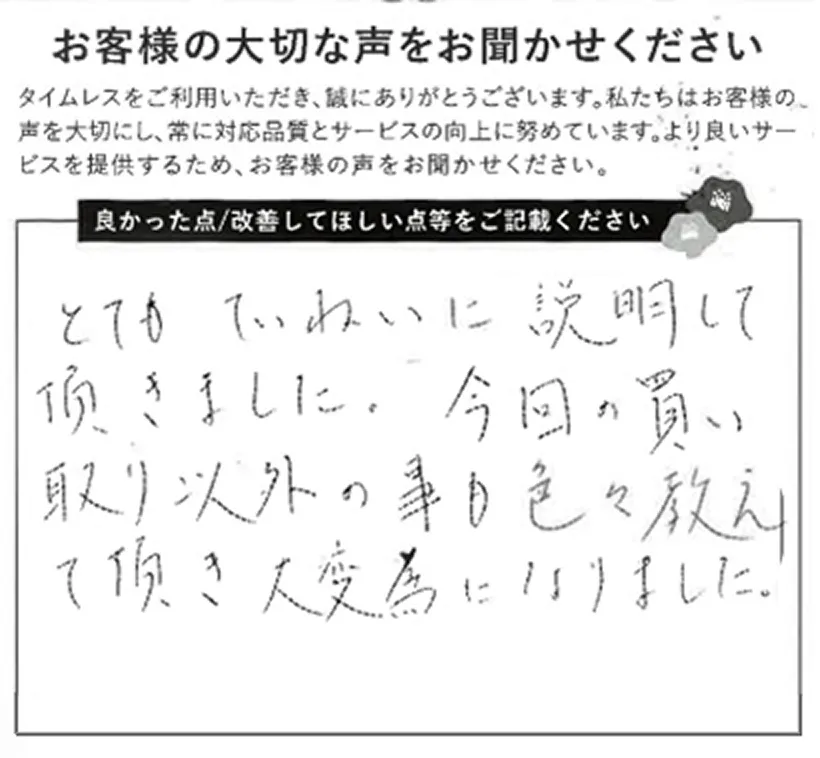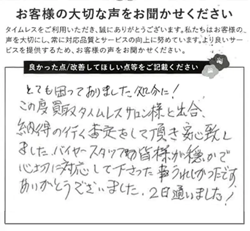 - タイムレスでは、店頭買取、宅配買取、訪問買取の3つの方法をご用意しております。お急ぎの場合やその場で現金化をご希望される場合は、店頭買取がおすすめです。ご予約不要で査定させていただきます。もちろん、一部店舗ではご予約も承っておりますので、お問い合わせください。自宅にいながら手軽に買取を希望する方は宅配買取、量が多い場合や店舗への持ち込みが難しい方は訪問買取をご利用ください。