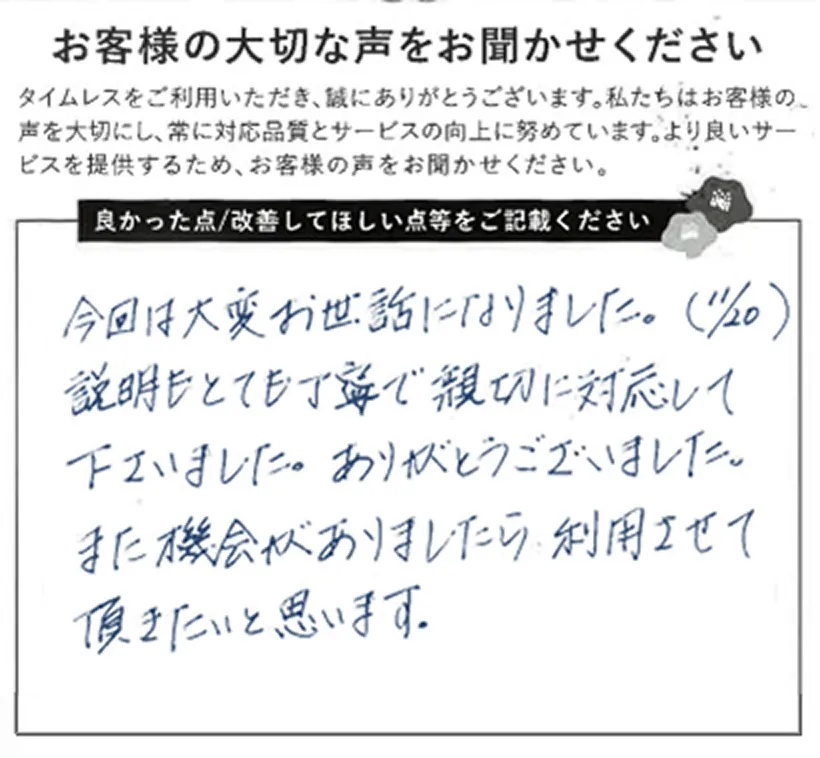 査定完了後、その場で現金をお渡しします。手続きはスピーディーで、銀行振込にも対応。急ぎの方にも最適です。※3